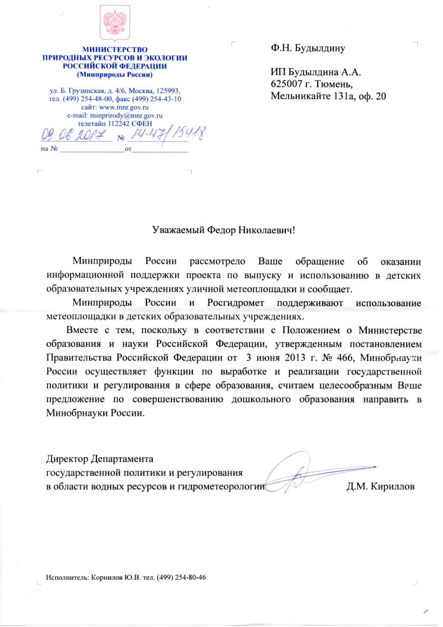 - Минприроды России и Росгидромед поддерживают использование метеоплощадки в детских образовательных учреждениях.